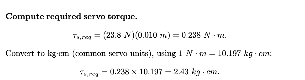 Torque calcs and discussion: We used a 5V servo motor that has a torque output between 1.5 kg-cm to 10+ kg-cm. To ensure that user’s felt the pull of the brace through the vest, we used a nylon string that was able to withstand about 10N-30N of tension before permanent deformation.