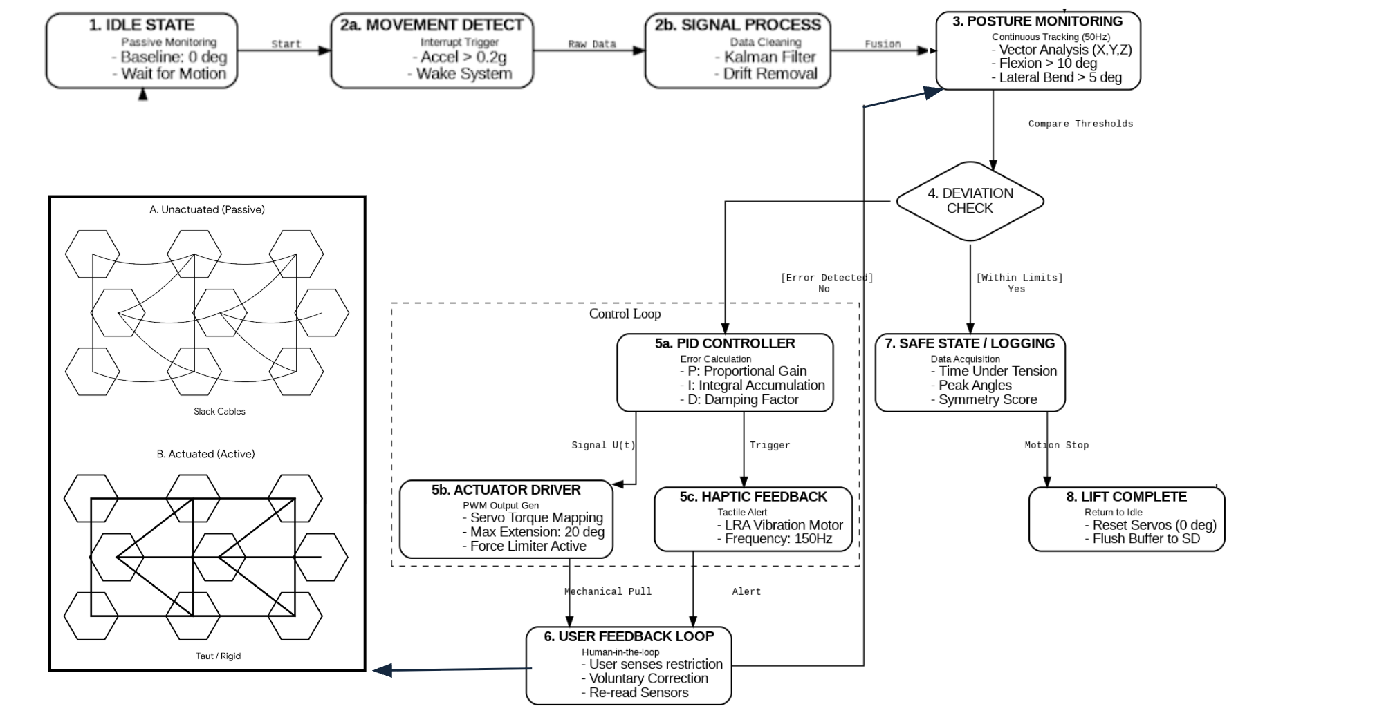 The prototype functionality will depend on air supply from a system of solenoids connected to a 16g CO2 cartridge. The system of solenoids and IMUs will be connected using a microcontroller. When the device detects poor posture, the entrance solenoid will be signaled to pressurize the actuator. When pressurized, the bladder inflates asymmetrically, causing expansion towards the non-extensible side. This will generate directional force and enable the actuator to produce corrective cues. While the force generated by the actuators will not be sufficient to overcome the musculoskeletal force generated by the user, it will alert the wearer and assist in adjusting posture in real time.